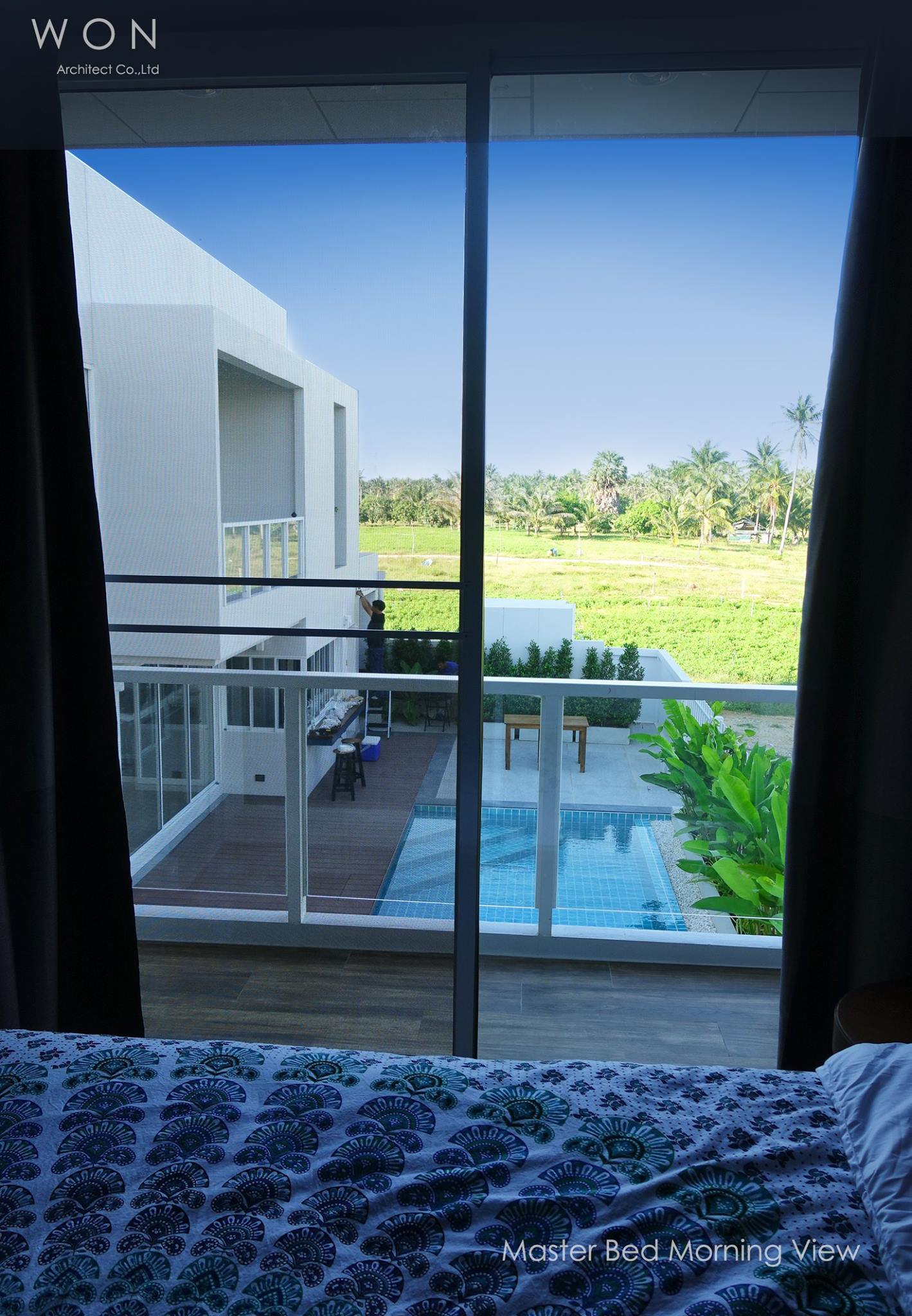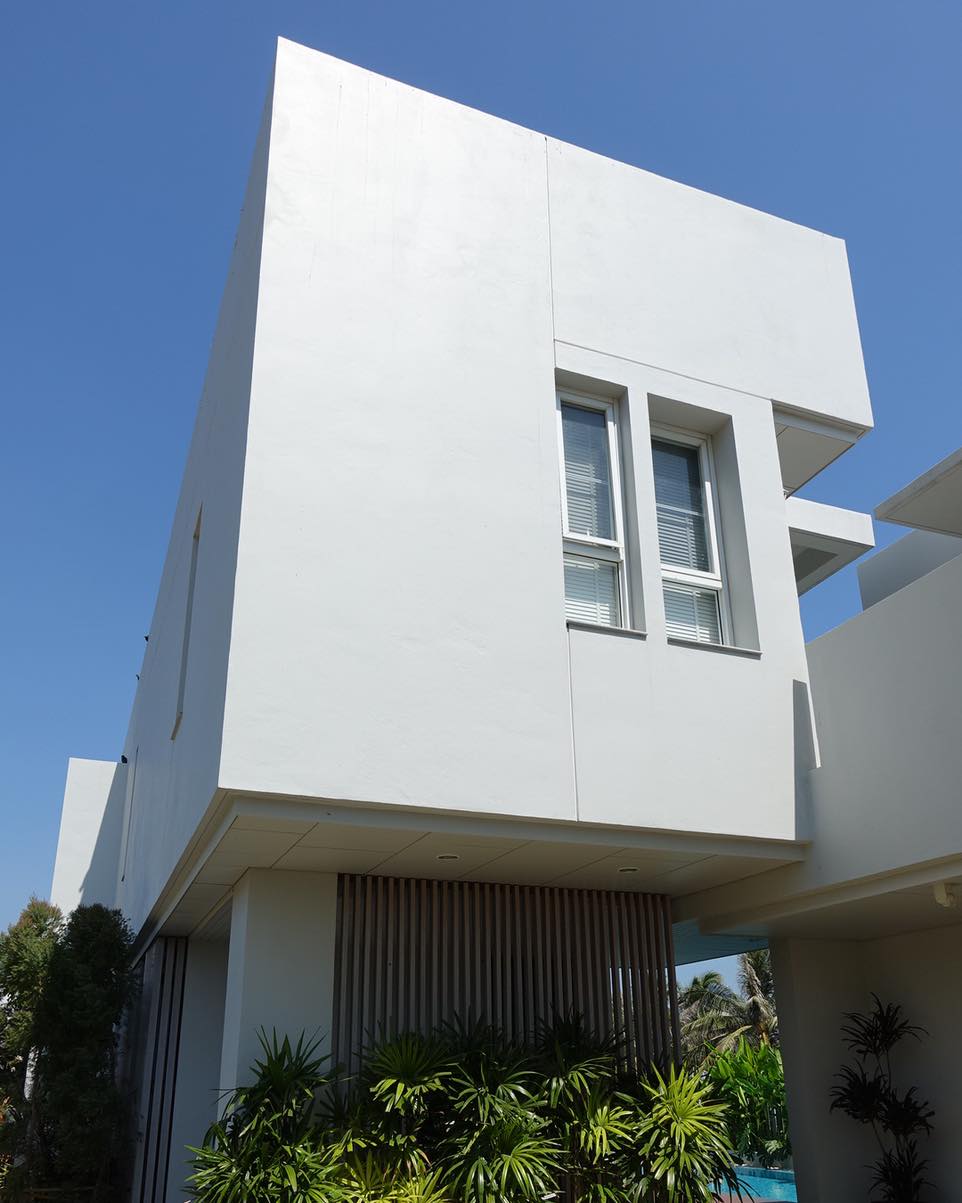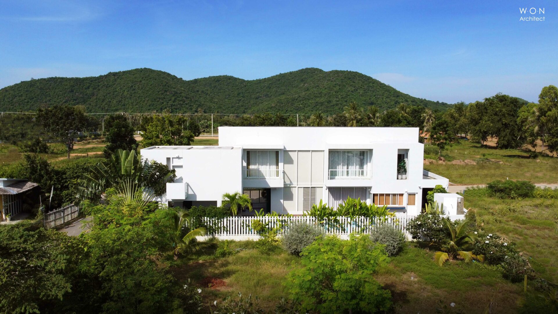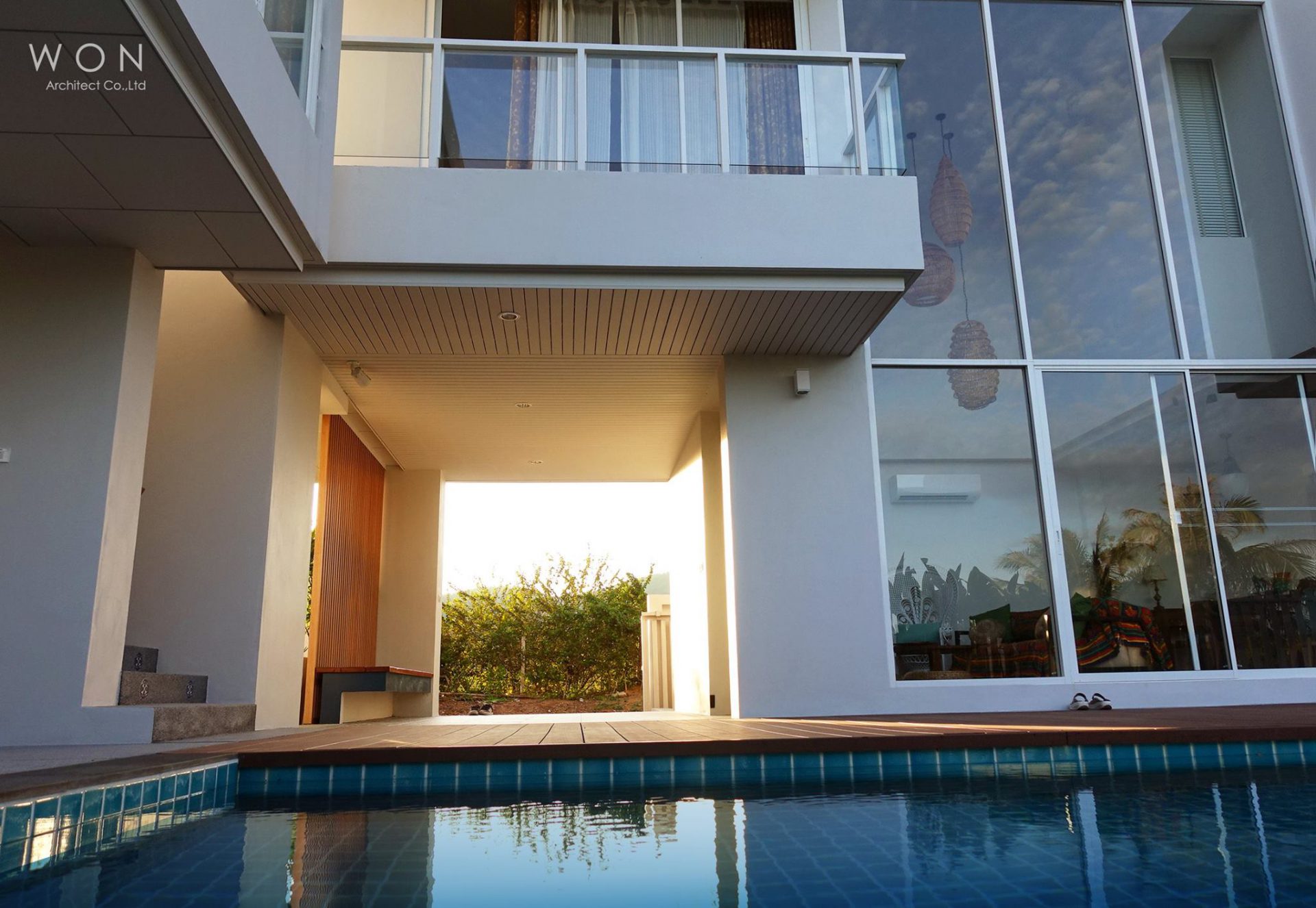บ้านพูลวิลล่ามินิมอลสีขาวกลางพื้นที่สีเขียวขนาดใหญ่อาคาร ตัว L โอบสระว่ายน้ำ ตัวอาคารบังแดดให้สระว่ายน้ำช่วงบ่าย และทุกห้องนอนได้มุมมองเห็นสระว่ายน้ำและพื้นที่สีเขียว