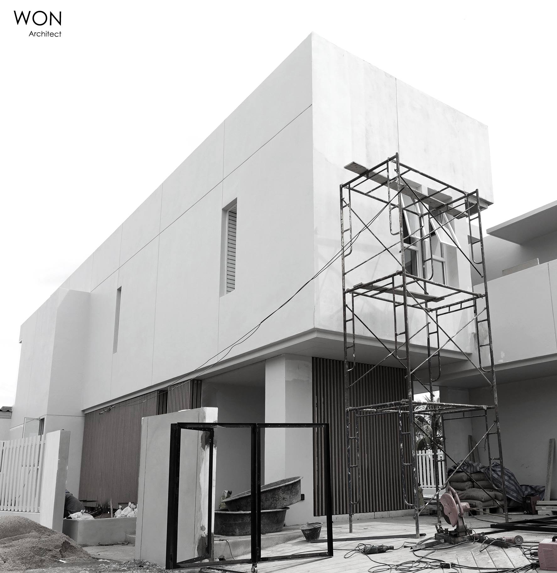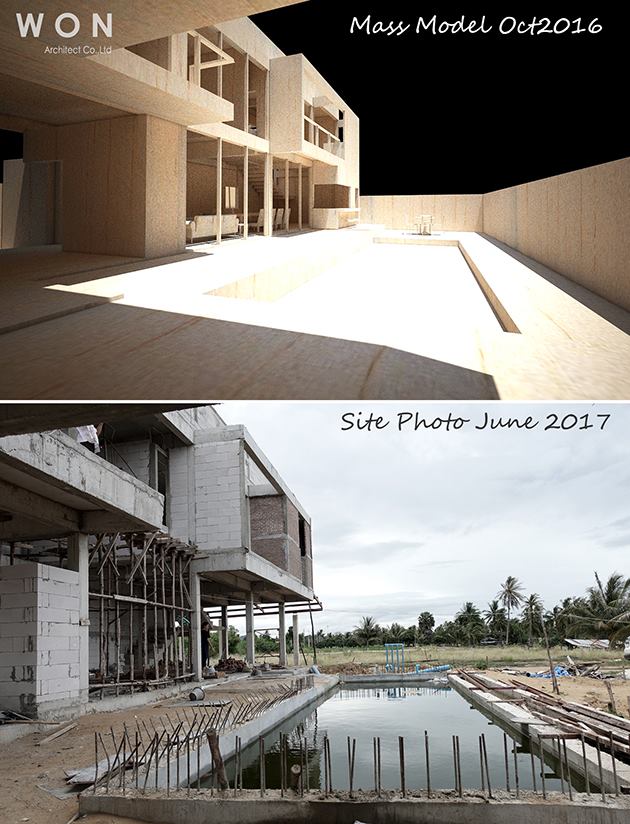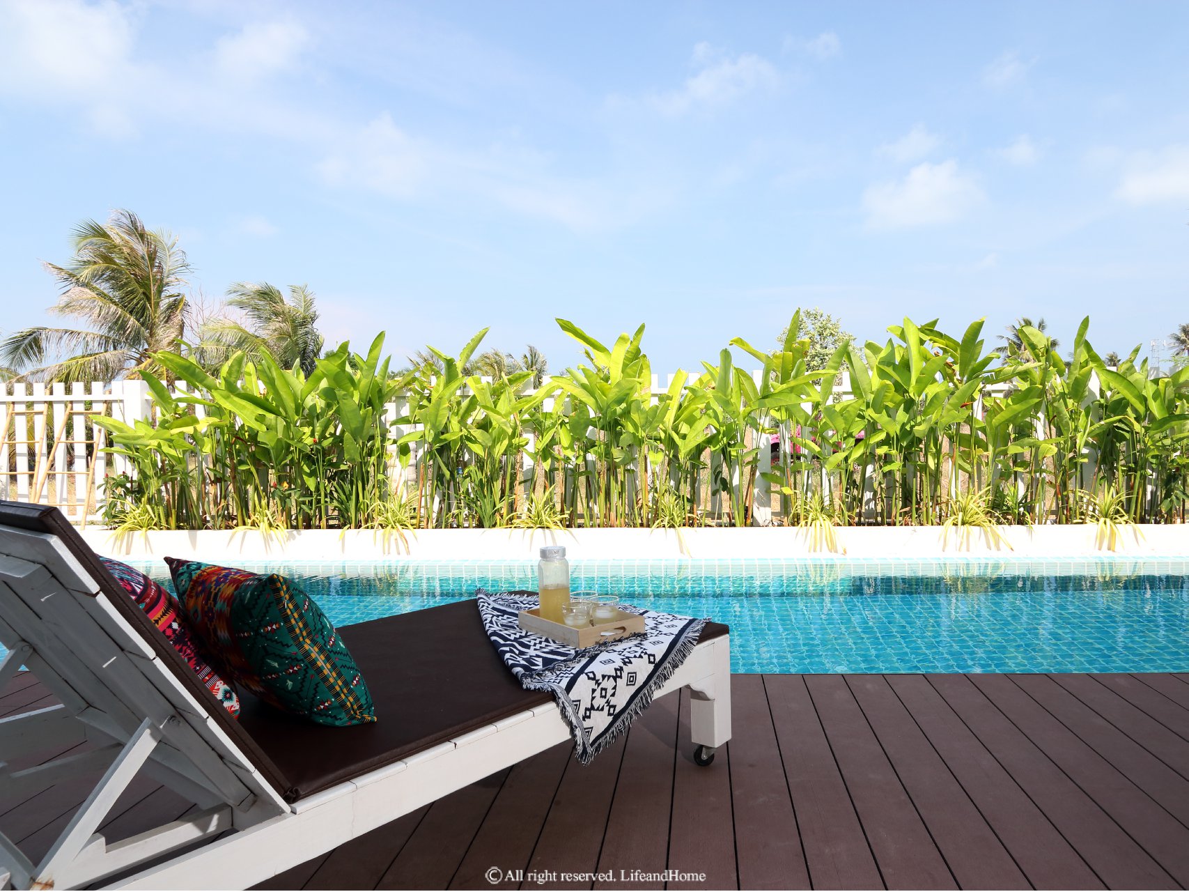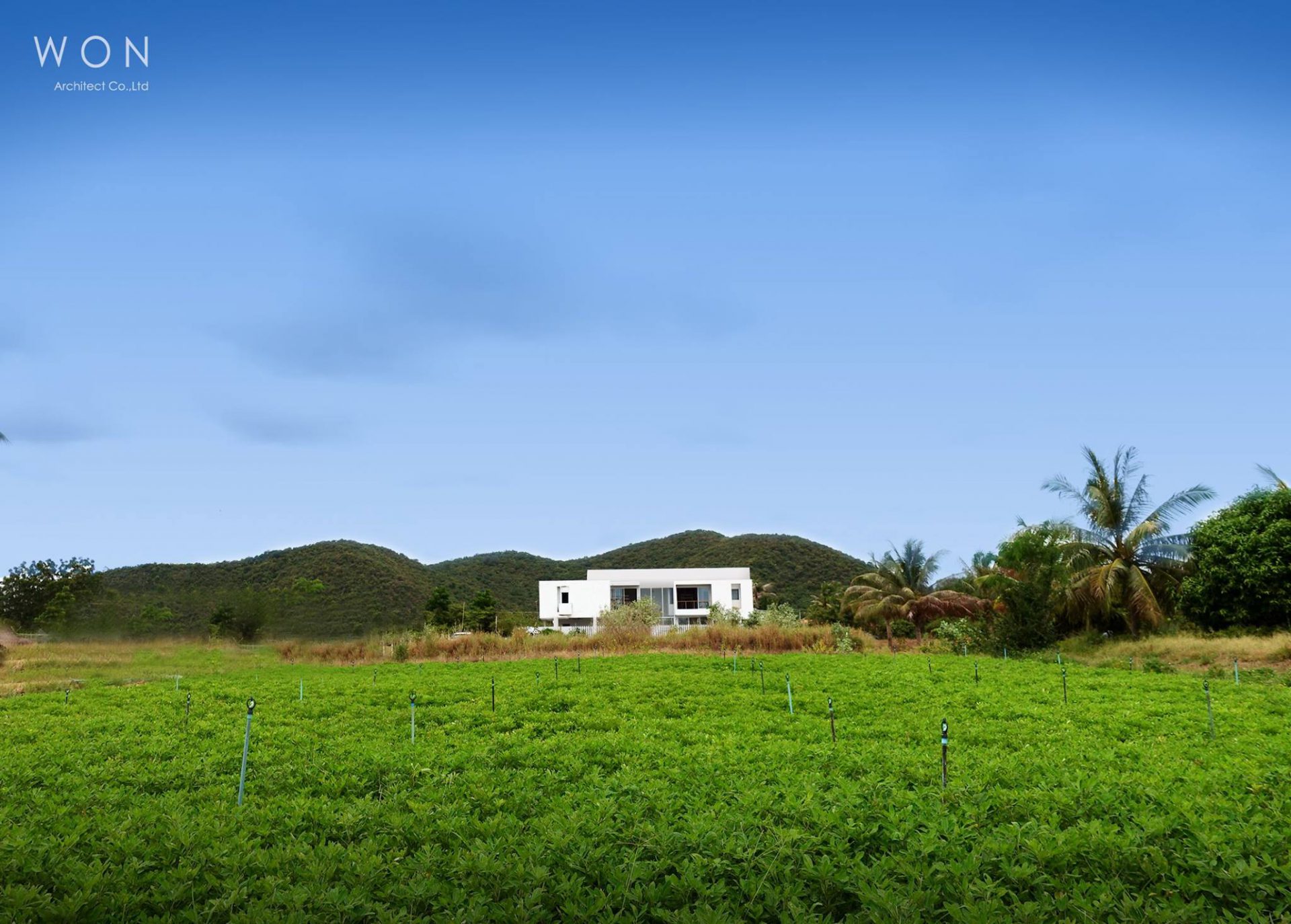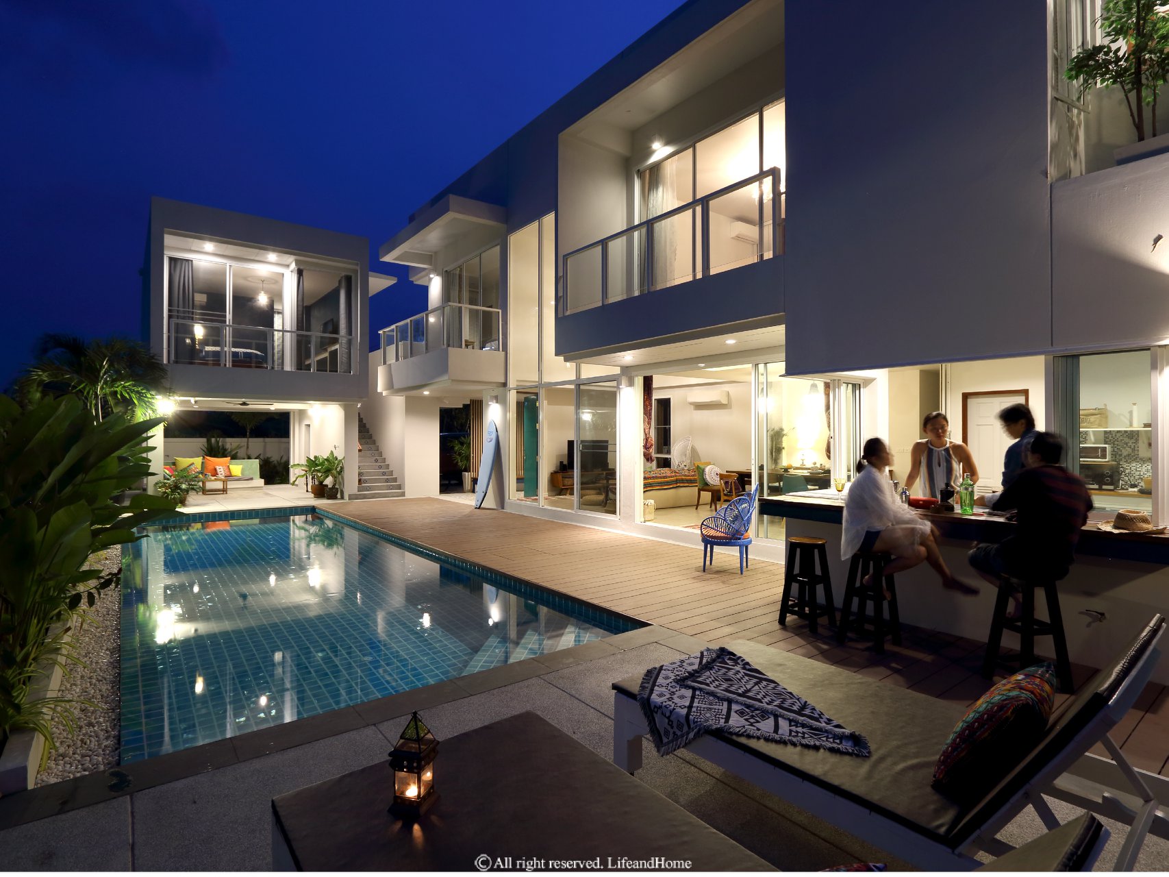 บ้านพูลวิลล่ามินิมอลสีขาวกลางพื้นที่สีเขียวขนาดใหญ่อาคาร ตัว L โอบสระว่ายน้ำ ตัวอาคารบังแดดให้สระว่ายน้ำช่วงบ่าย และทุกห้องนอนได้มุมมองเห็นสระว่ายน้ำและพื้นที่สีเขียว