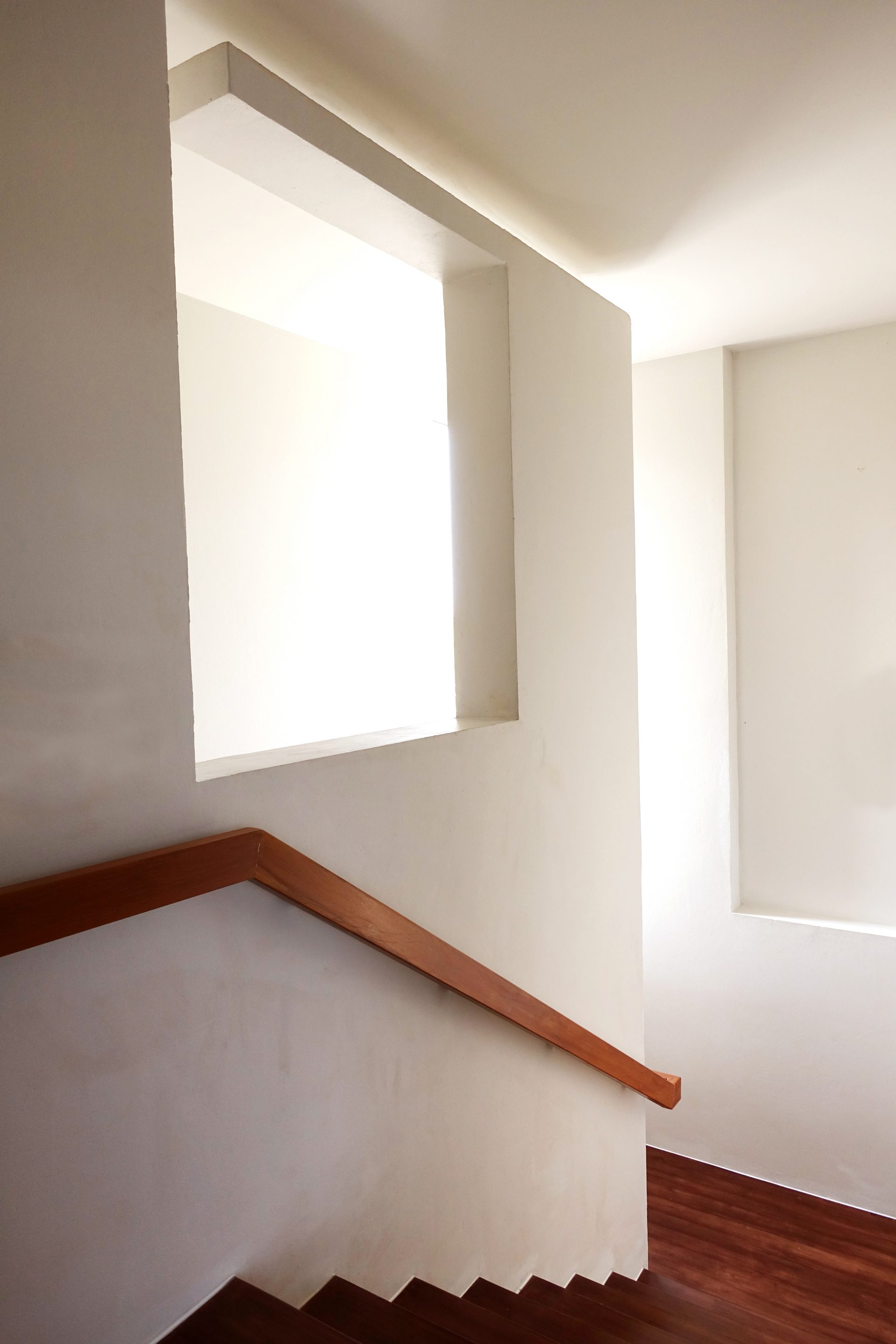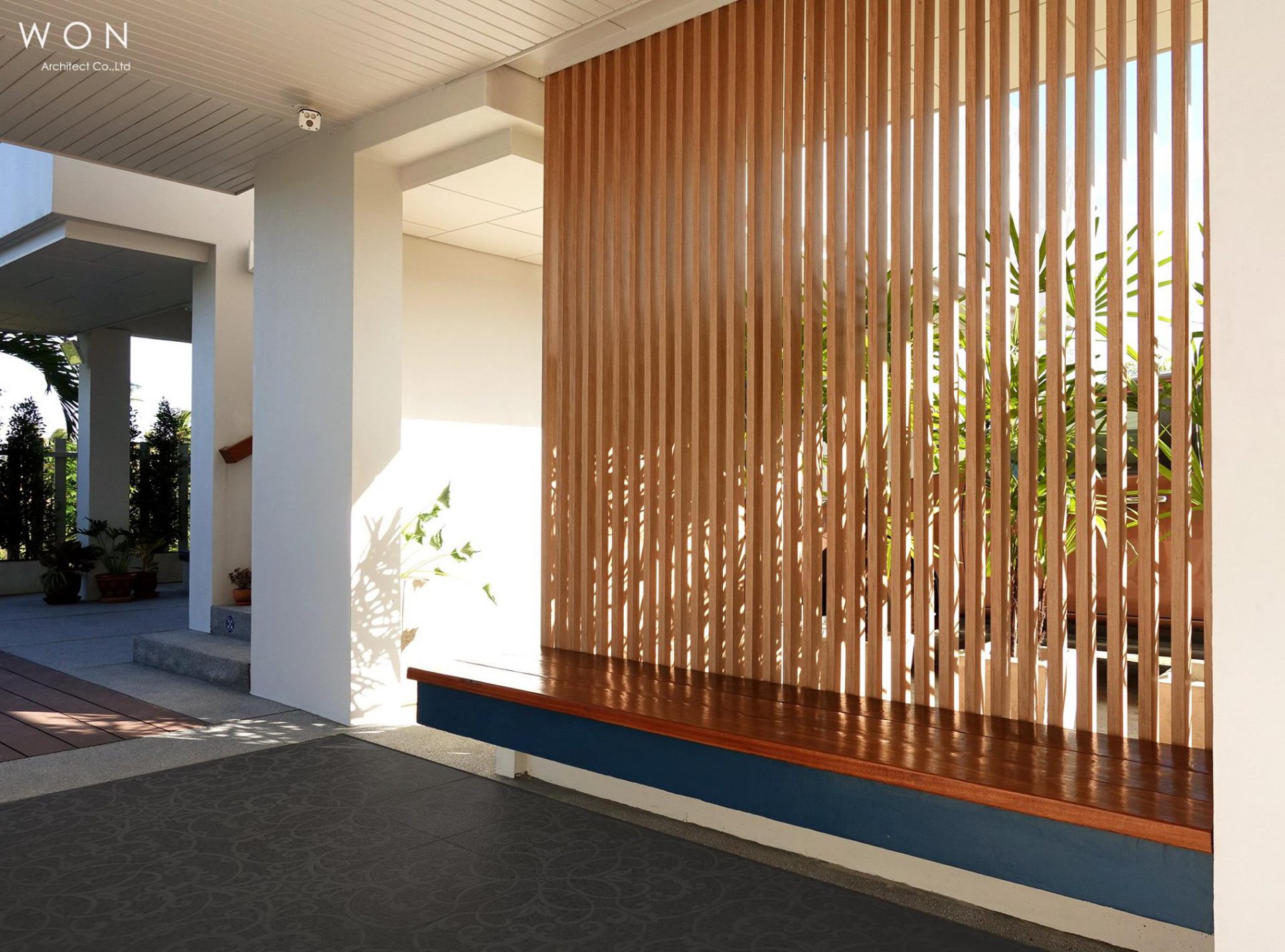 Sustainability and passive cooling principles guide the design. The villa takes advantage of Pranburi’s excellent natural ventilation, promoting cross-breezes throughout the entire house. To reduce heat gain, the west façade incorporates minimal glazing and double walls with a 10-cm air gap for thermal insulation. Additionally, the southwest stairwell functions as a heat buffer, protecting interior spaces from direct sunlight.