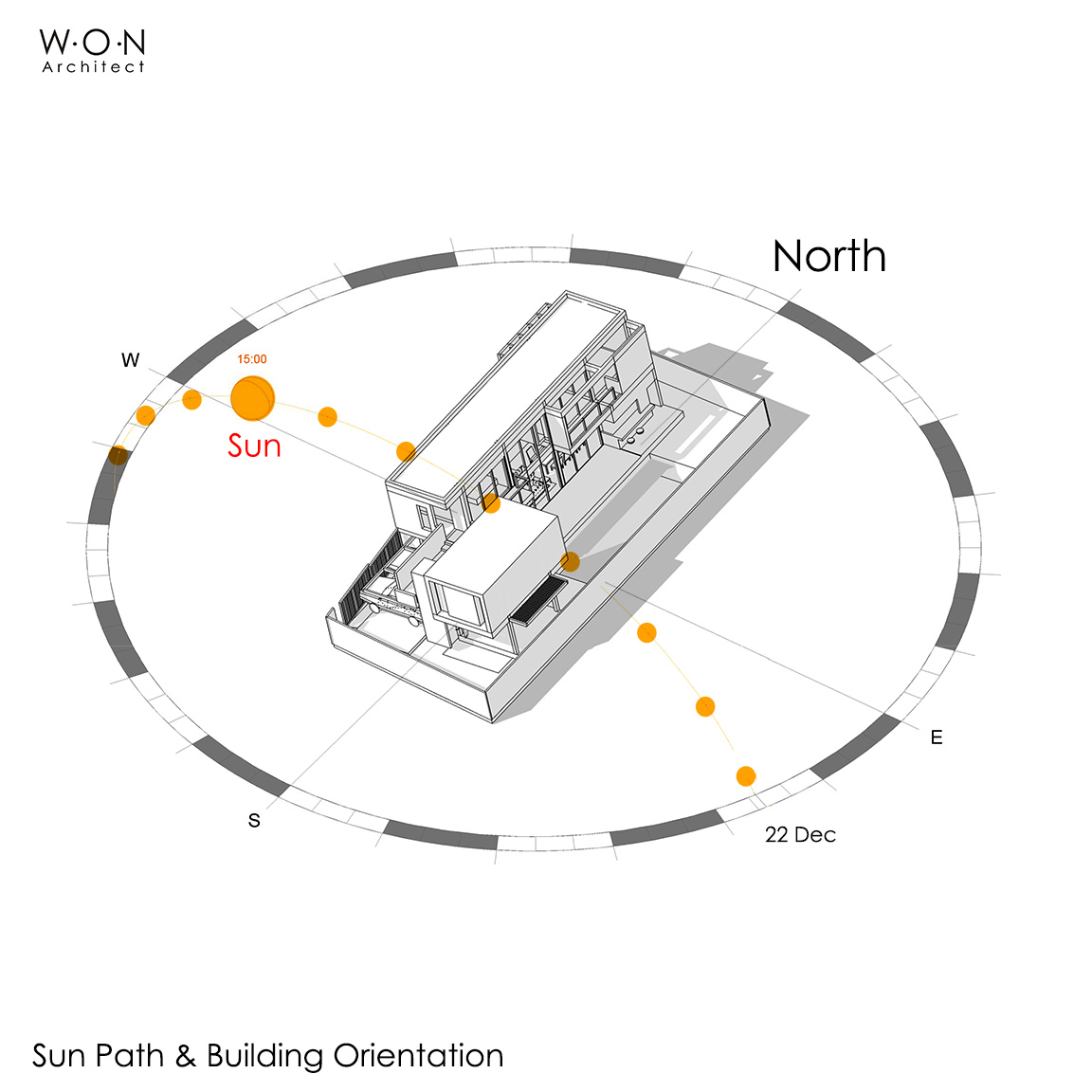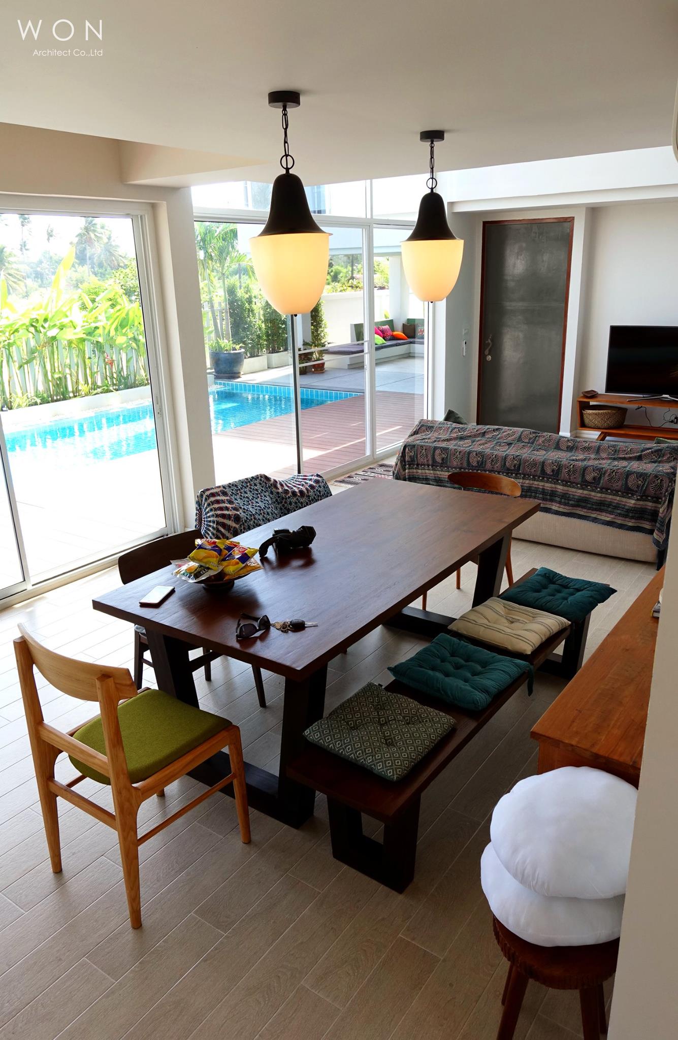 The villa offers breathtaking west-facing mountain views and east-facing proximity to the sea, allowing residents to experience both sunrise and sunset in comfort. Designed in an L-shaped open-plan layout, the living and dining areas run parallel to the pool on the northeast side. This strategic orientation serves two main purposes: eliminating visual glare from the pool and allowing the building’s mass to cast natural shade over the pool and deck during the afternoon — ideal for the owner, who prefers late-day swimming. A pool bar counter located on the north side connects directly to the kitchen, ensuring convenient service and functionality.