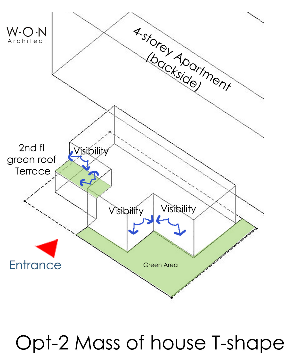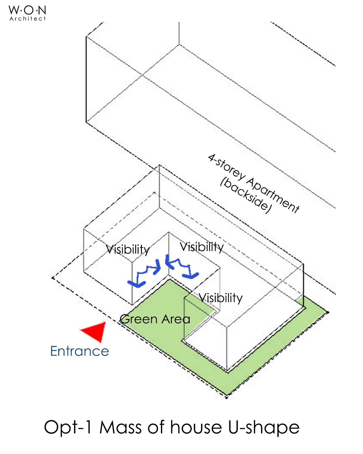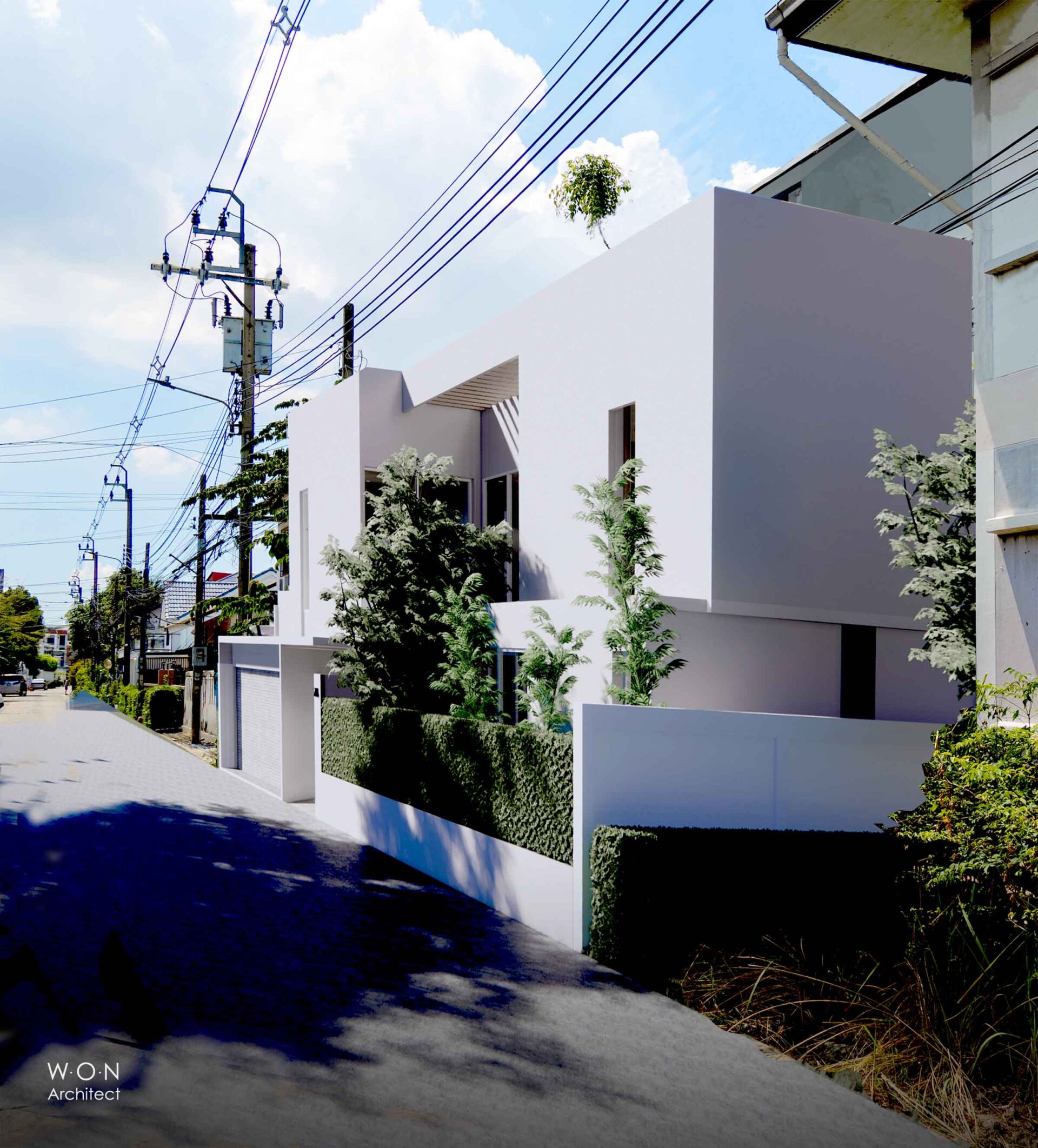 โจทย์สำคัญของโครงการนี้คือการตั้งอยู่ใกล้กับอาคารอพาร์ตเมนต์สูง 4 ชั้นทางทิศตะวันตก ทีมสถาปนิกจึงออกแบบแนวผนังทึบในฝั่งทิศตะวันตกเพื่อทำหน้าที่เป็น Buffer Zone ช่วยบังสายตาและลดความร้อนจากแสงแดดในช่วงบ่าย (Heat Gain) โดยจัดวางบันไดแนวยาวไว้ในโซนนี้ เพื่อปกป้องพื้นที่ใช้สอยหลักอย่าง ห้องนั่งเล่น ห้องรับประทานอาหาร และห้องนอน ให้คงความเย็นสบายตลอดวัน