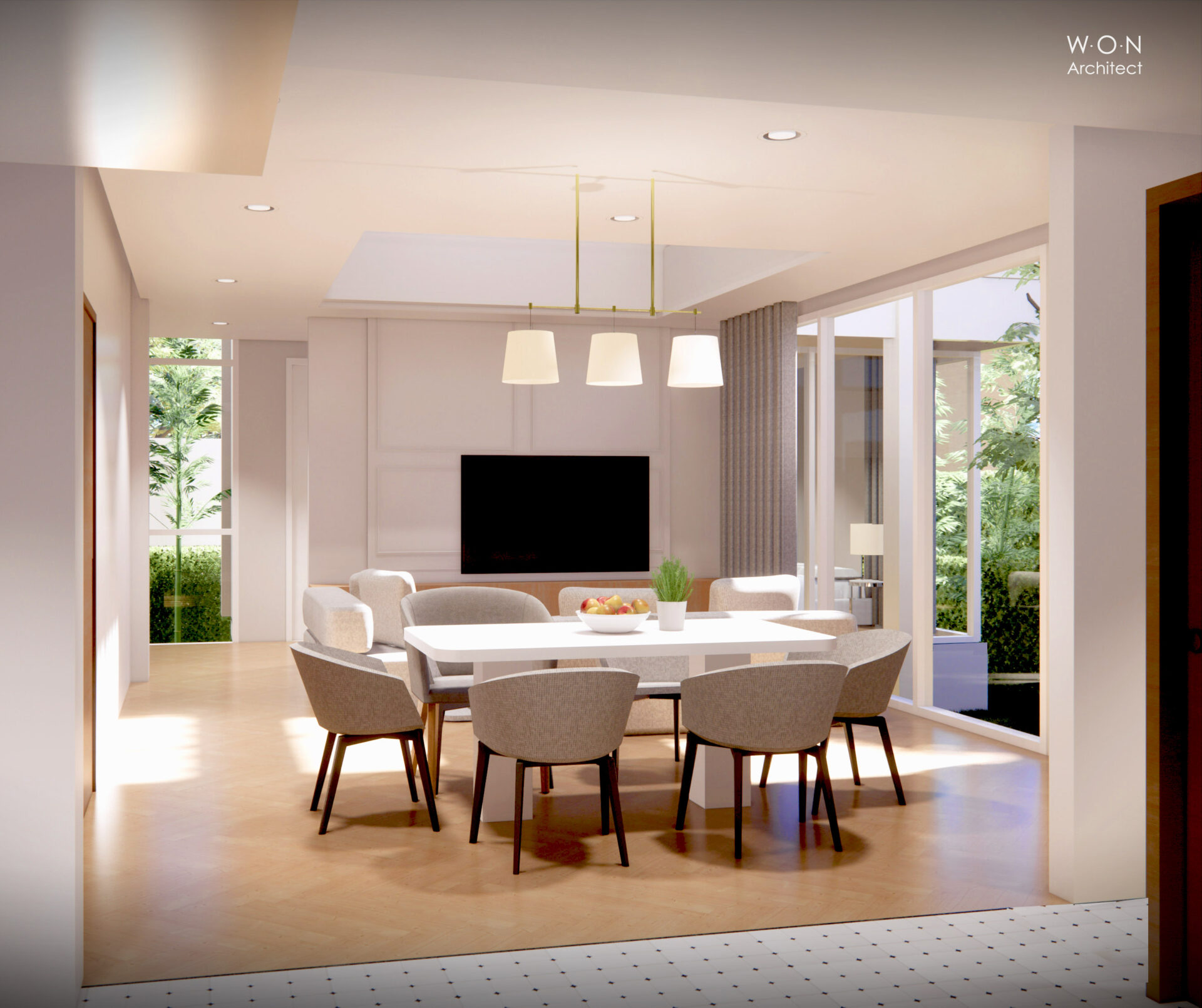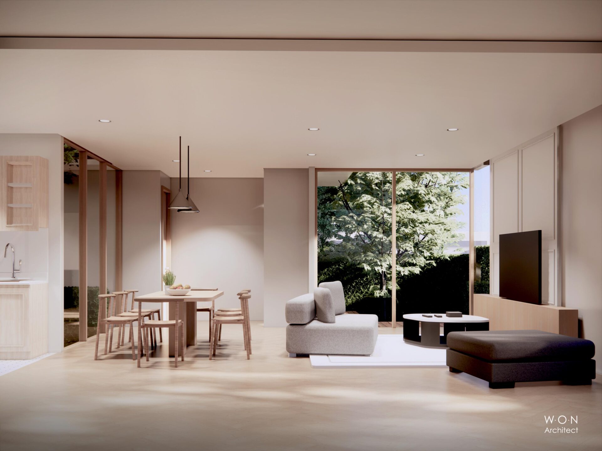 ในขณะที่ทิศตะวันตกเน้นความมิดชิด พื้นที่ฝั่งทิศตะวันออกกลับเปิดรับความสดใสด้วยผนังกระจกใสที่เชื่อมต่อกับ Central Courtyard ช่วยให้ลมพัดผ่านได้สะดวกและรับแสงสว่างธรรมชาติในยามเช้า ทำให้บ้านหน้ากว้างหลังนี้ไม่ใช่แค่สวยงาม แต่ยังเป็นบ้านที่ “หายใจได้” และตอบโจทย์การใช้ชีวิตในเขตกรุงเทพฯ อย่างแท้จริง