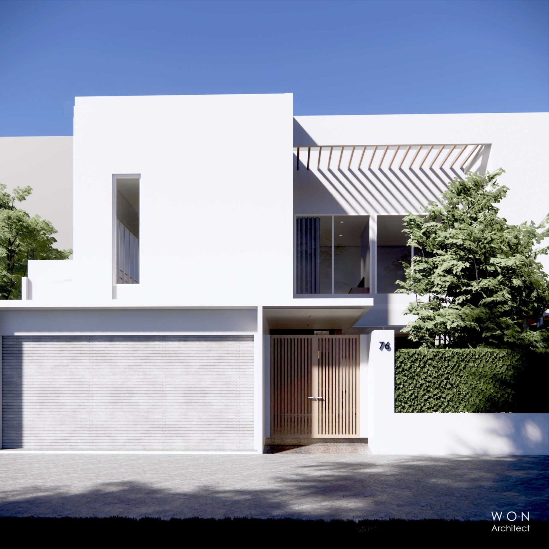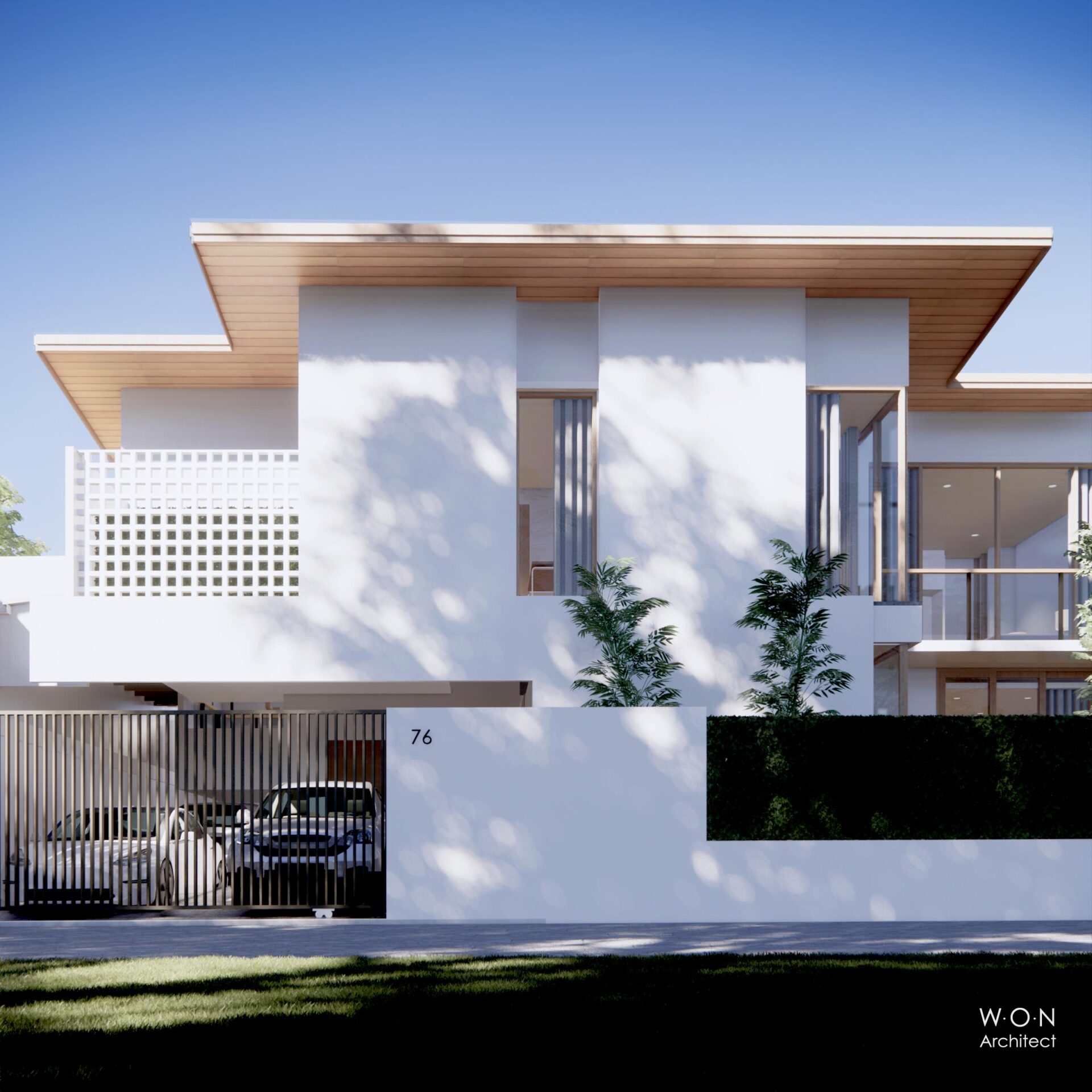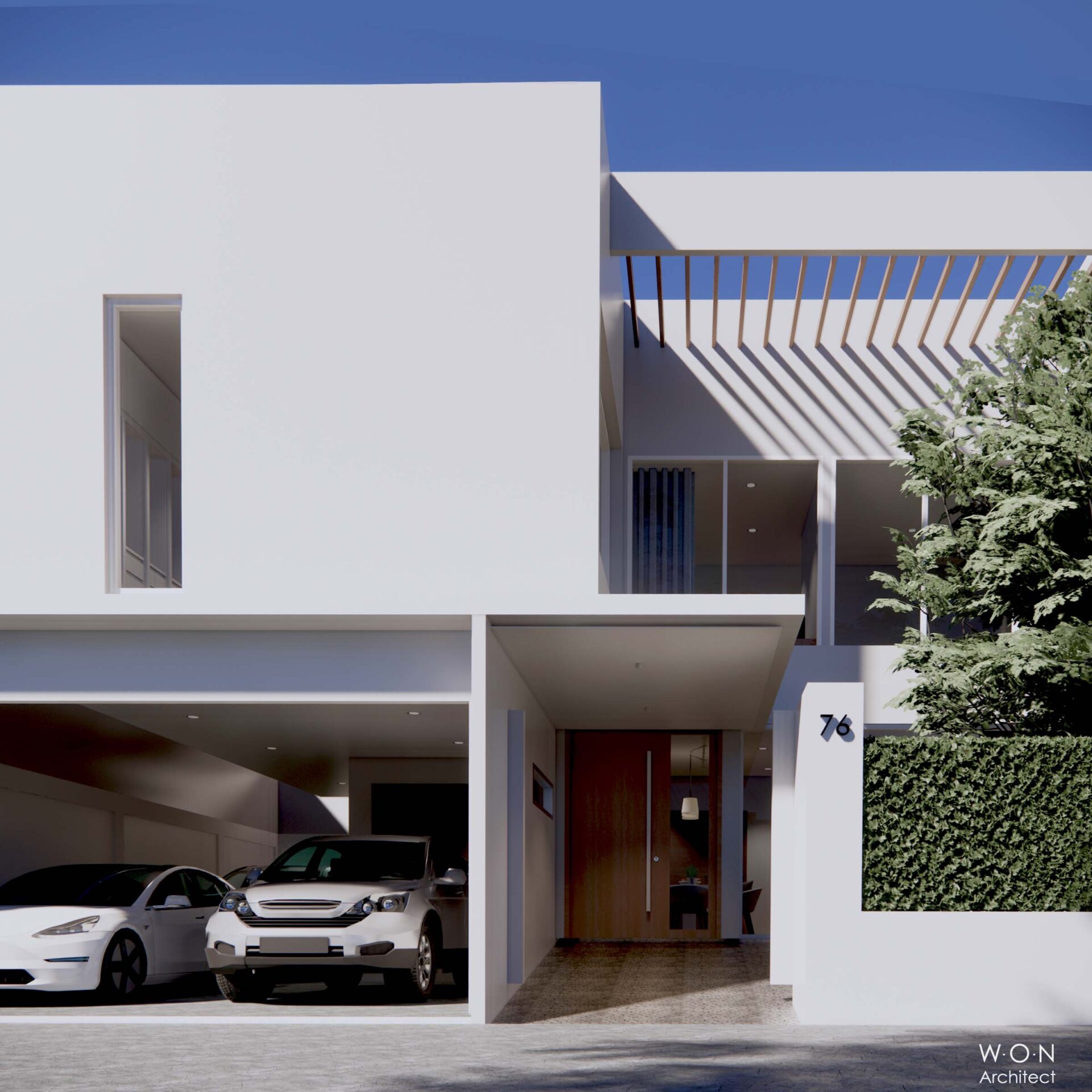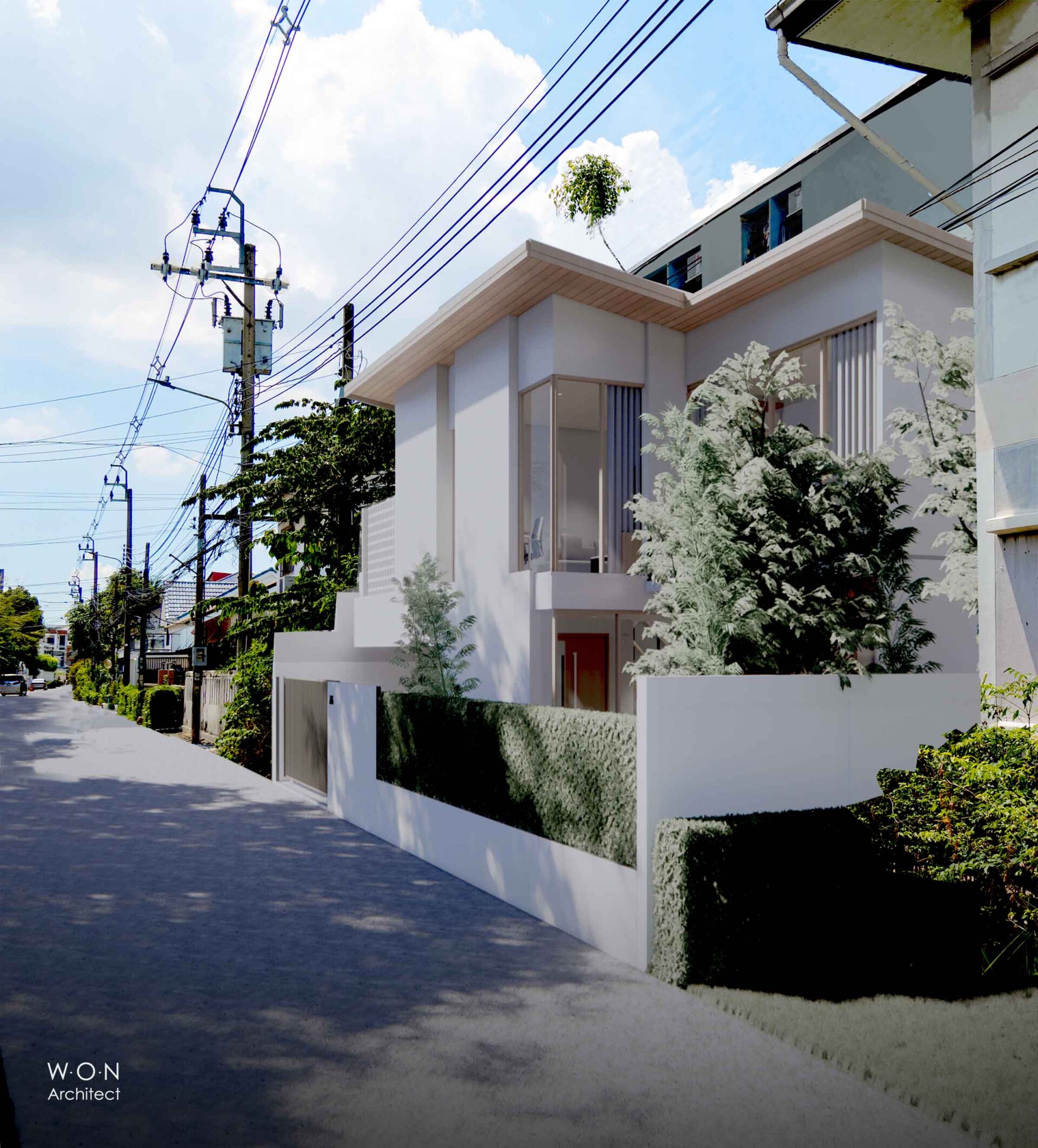 Looking for modern 2-story house ideas for narrow or overlooked plots? This Bangkhen Modern House project demonstrates a masterclass in passive cooling and privacy design. By adopting a U-shape architecture, we oriented the green courtyard to the East to capture morning light. To combat the heat and the privacy concerns of a nearby 4-story building, the West wing features a solid thermal wall that protects the main living areas, making it the perfect energy-efficient home design for urban environments.”