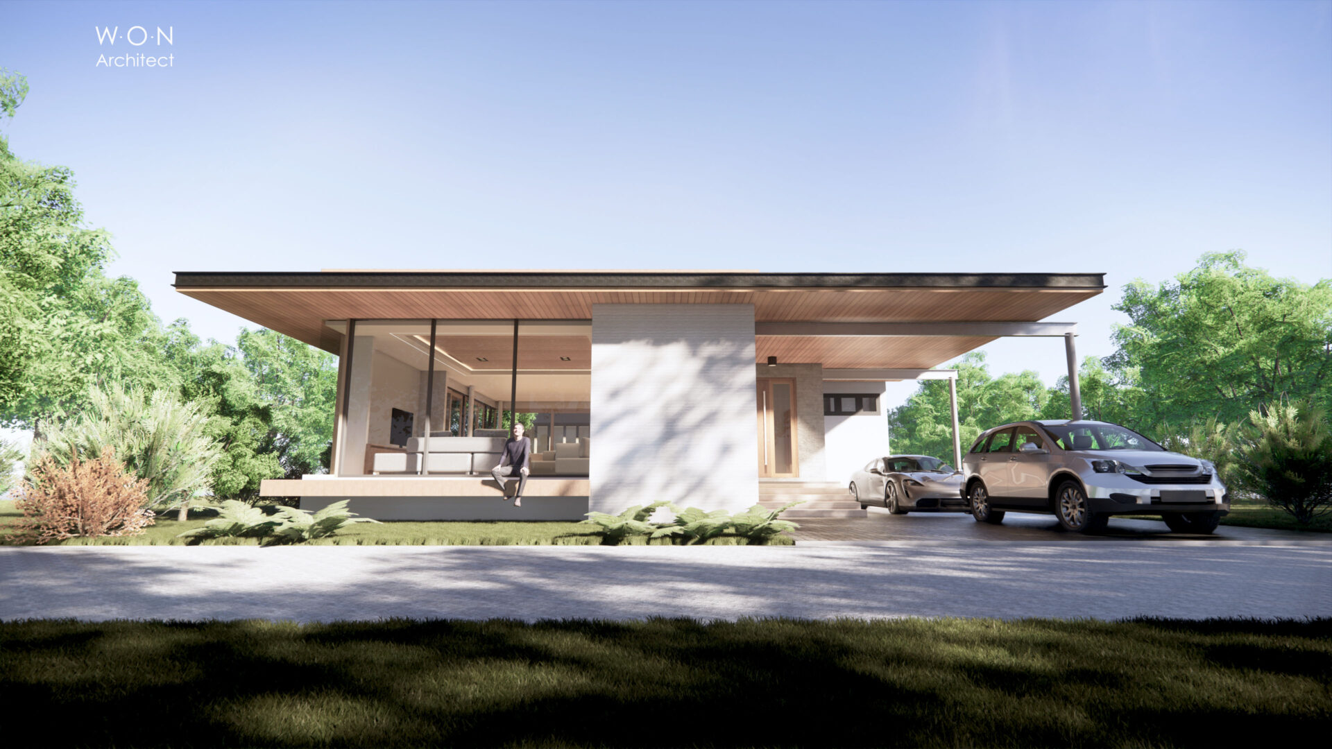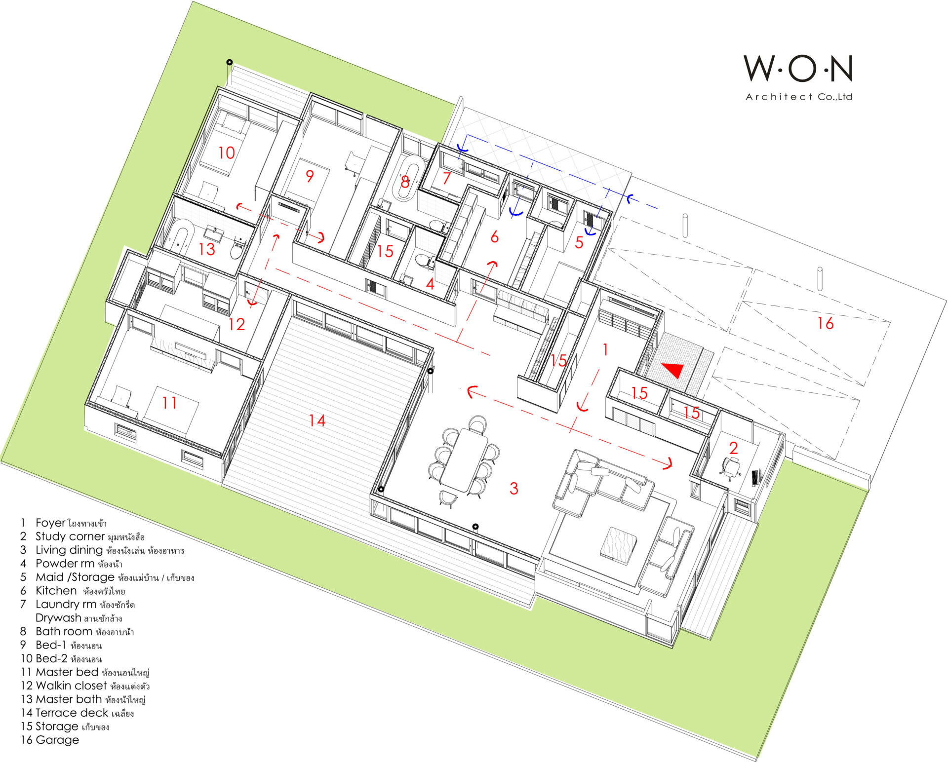 Single Storey house แบบบ้านชั้นเดียว U-shape180sq.m (Land17x28m) -One Storey 180 sq.m house (Land Area 17x28m)-Simply design. The purpose of the courtyard terrace in the middle is to maximize natural light and ventilation in every room ‘no windowless room’. And all bedrooms face their own window to the green area. Basically planning ‘Public space’ open-plan living dining in the front and ‘Private space’ all bed room in the backside. Study corner was located a the front of house for ‘work-from-home’ space still has privacy and good visibility location. On the other hand the back of the house (Kitchen, Laundry and Maid room separate the access in order to keep living dining not be disturbed