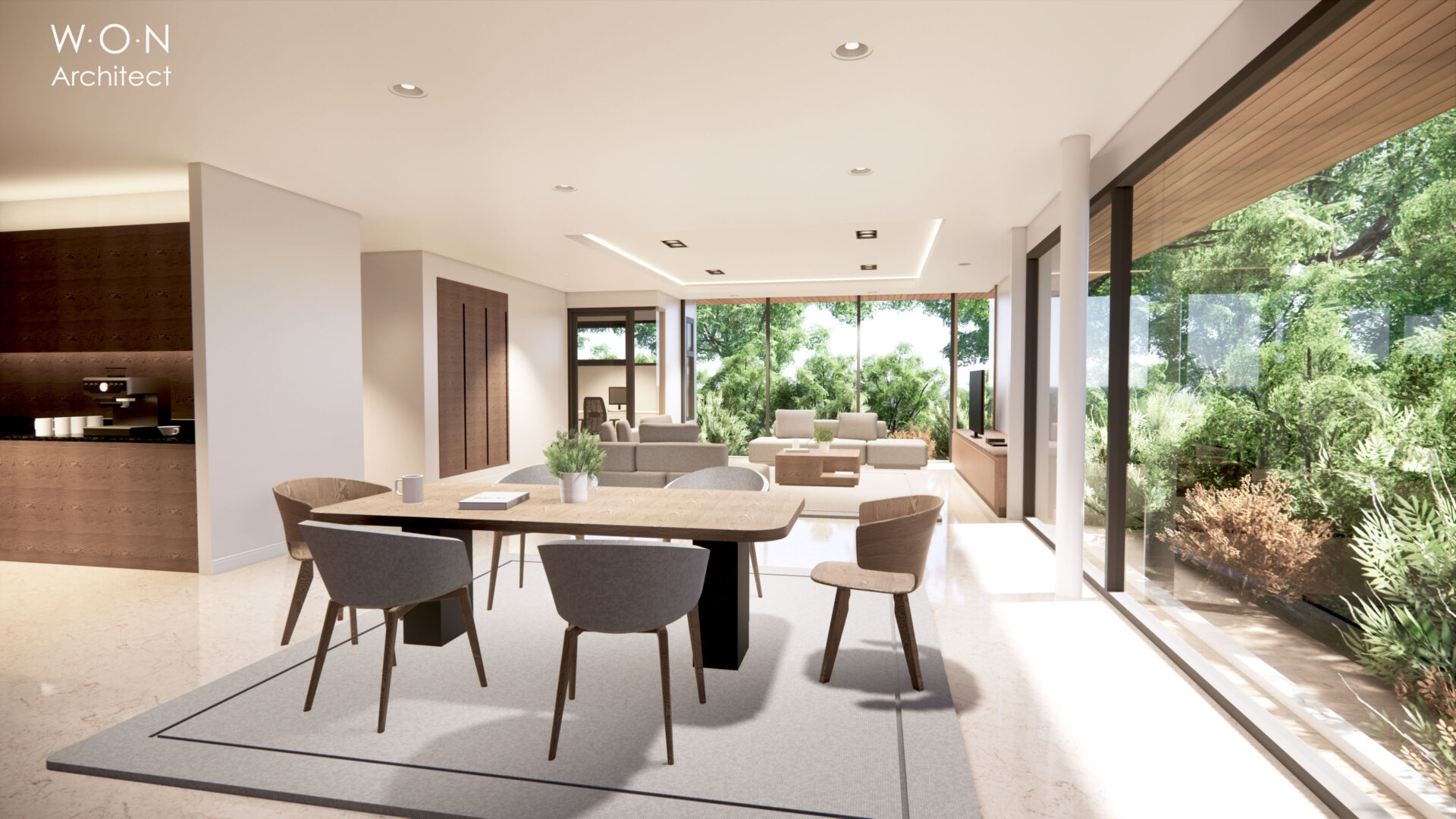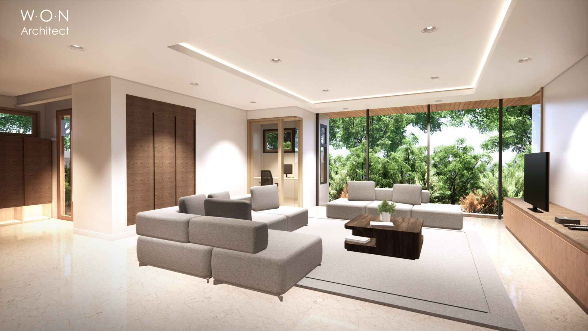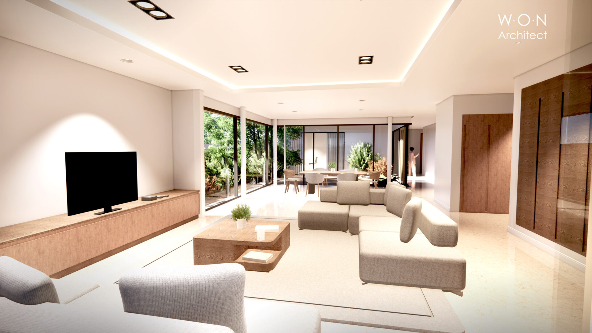 พืนที่ส่วนด้านหน้า Open-Plan ห้องรับแขก และ ห้องอาหาร พร้อมพื้นที่ มุมทำงานเล็กๆ และ กั้นด้วยผนังกระจก เพื่อกันเสียงและความเป้นส่วนตัว สามารถทำงานที่บ้านได้
