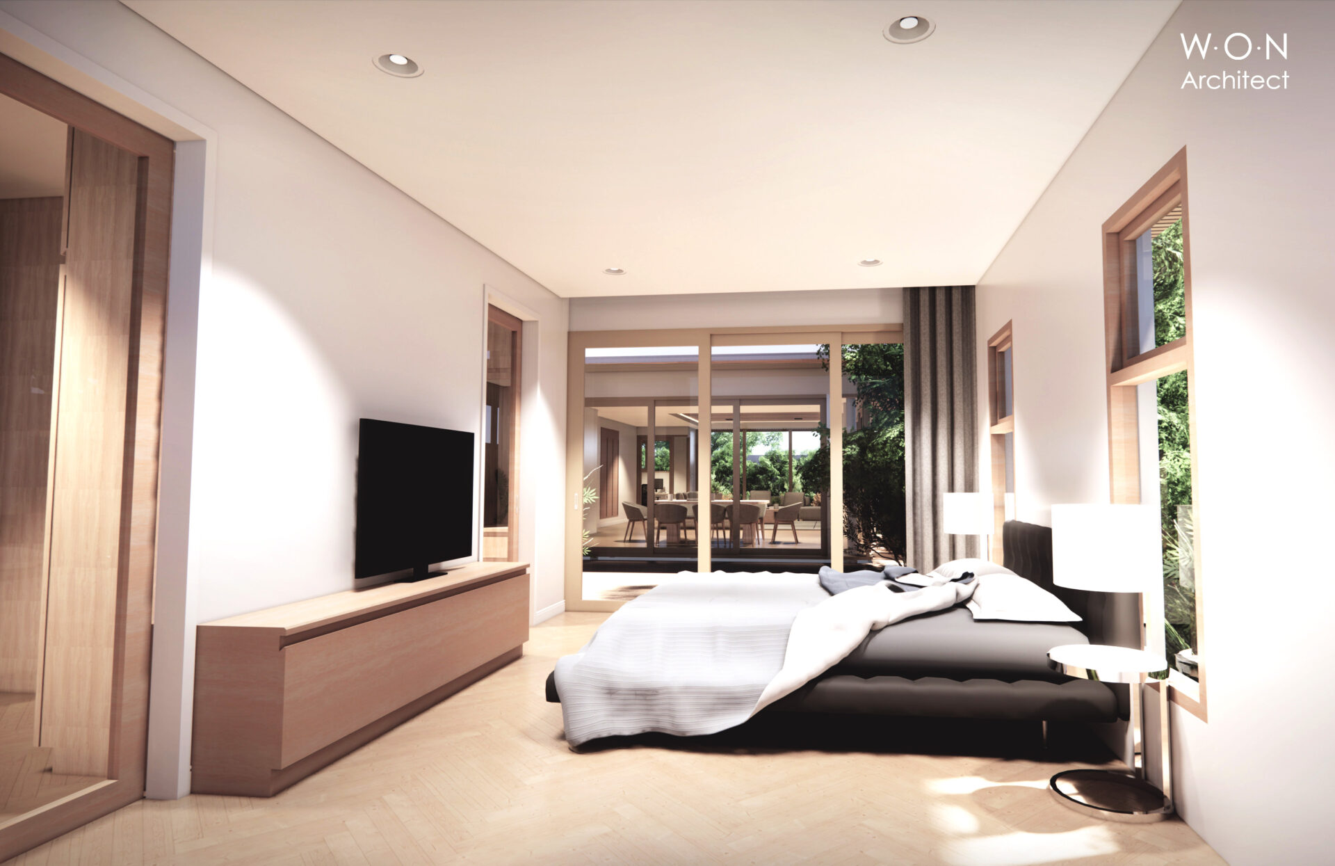 พื้นทีส่วนด้านหลังเป็น ห้องนอน และ พื้นที่ด้านข้างเป็นส่วนแม่บ้านส่วนพื้นที่แม่บ้าน และ ห้องซักล้างถูกแยกทางเข้าด้านข้างจากที่จอดรถ เพื่อมิให้รบกวน เจ้าของบ้าน
