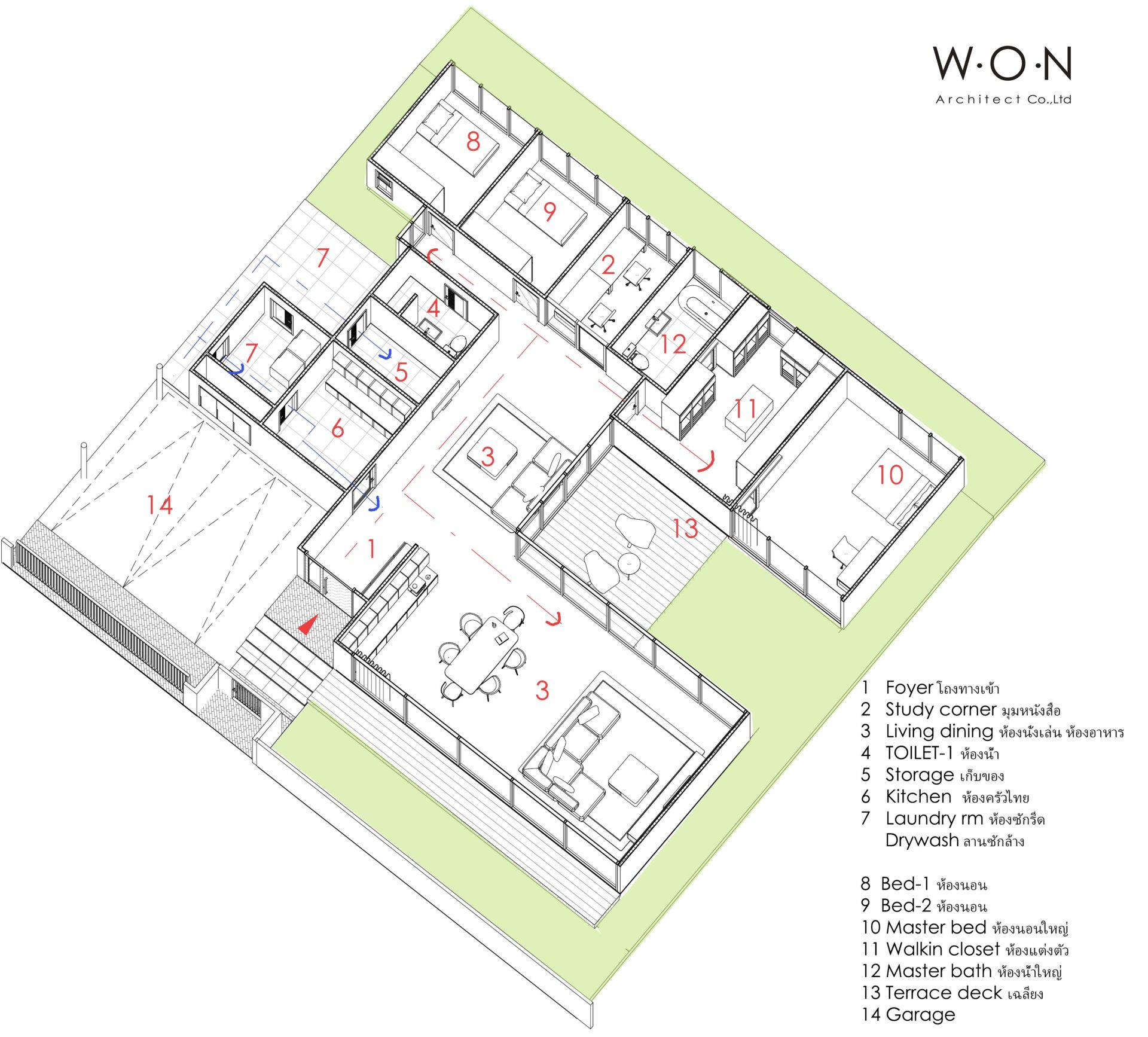 เฉลียงบ้านอยู่ตรงกลางเพื่อให้ทุกห้องได้ช่องแสงและลมธรรมชาติ เพื่อการให้ความใส่ใจกับคุณภาพชีวิตที่ดี ทุกห้องสามารถมองเห็นพื้นที่สีเขียวรอบตัวบ้าน และ ยังมีความเป็นส่วนตัวสูง