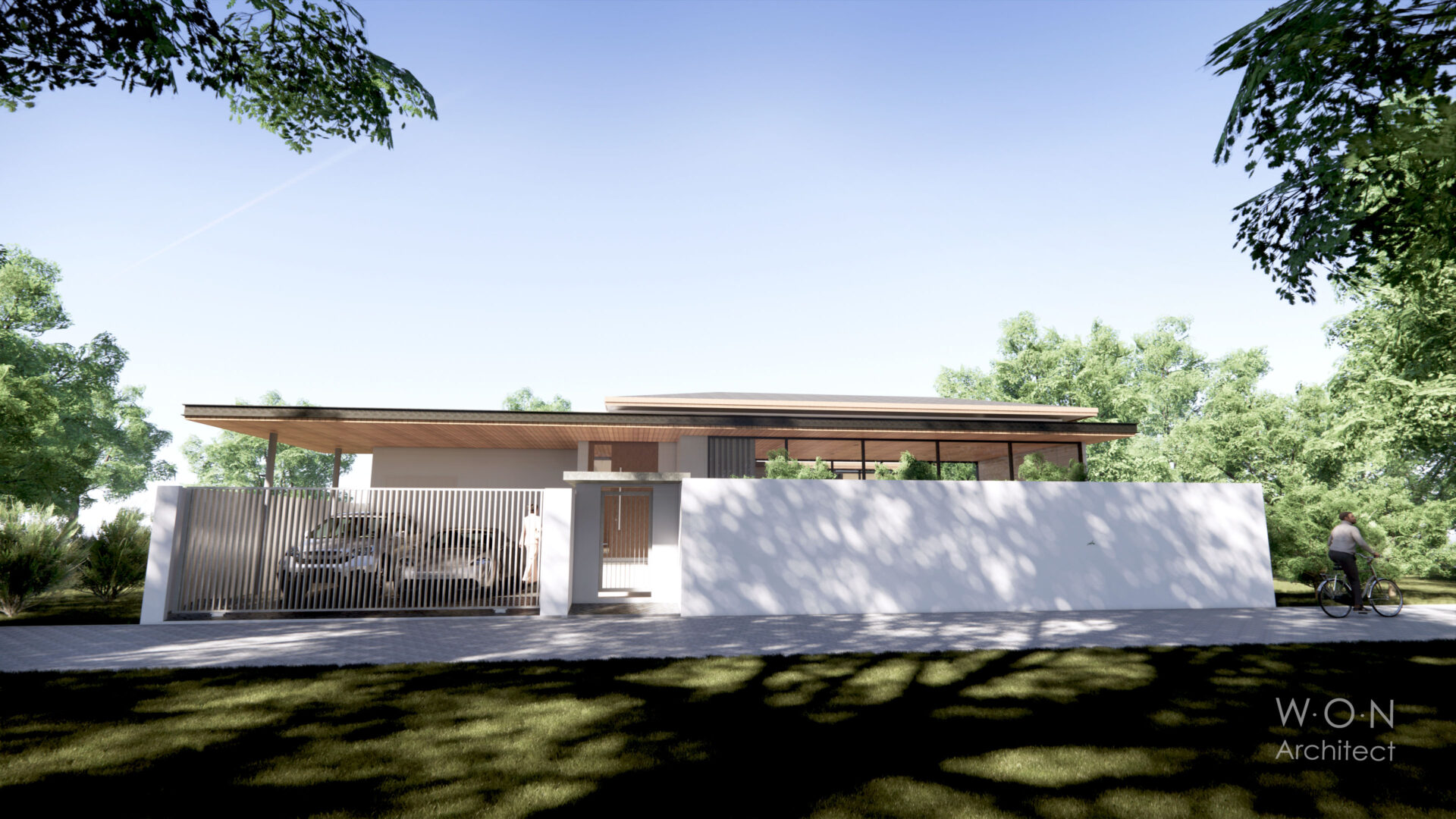 Single Storey House C-shape Land 20X20m is simply house design. The purpose of the courtyard terrace in the middle is to maximize natural light and ventilation in every room ‘no windowless room’. And all bedrooms face their own window to the green area. Basically planning ‘Public space’ open-plan living dining in the front and ‘Private space’ all bed room in the backside. the front of house for ‘work-. The back of the house (Kitchen, Laundry and Maid room separate the service access in order to keep living dining not be disturbed