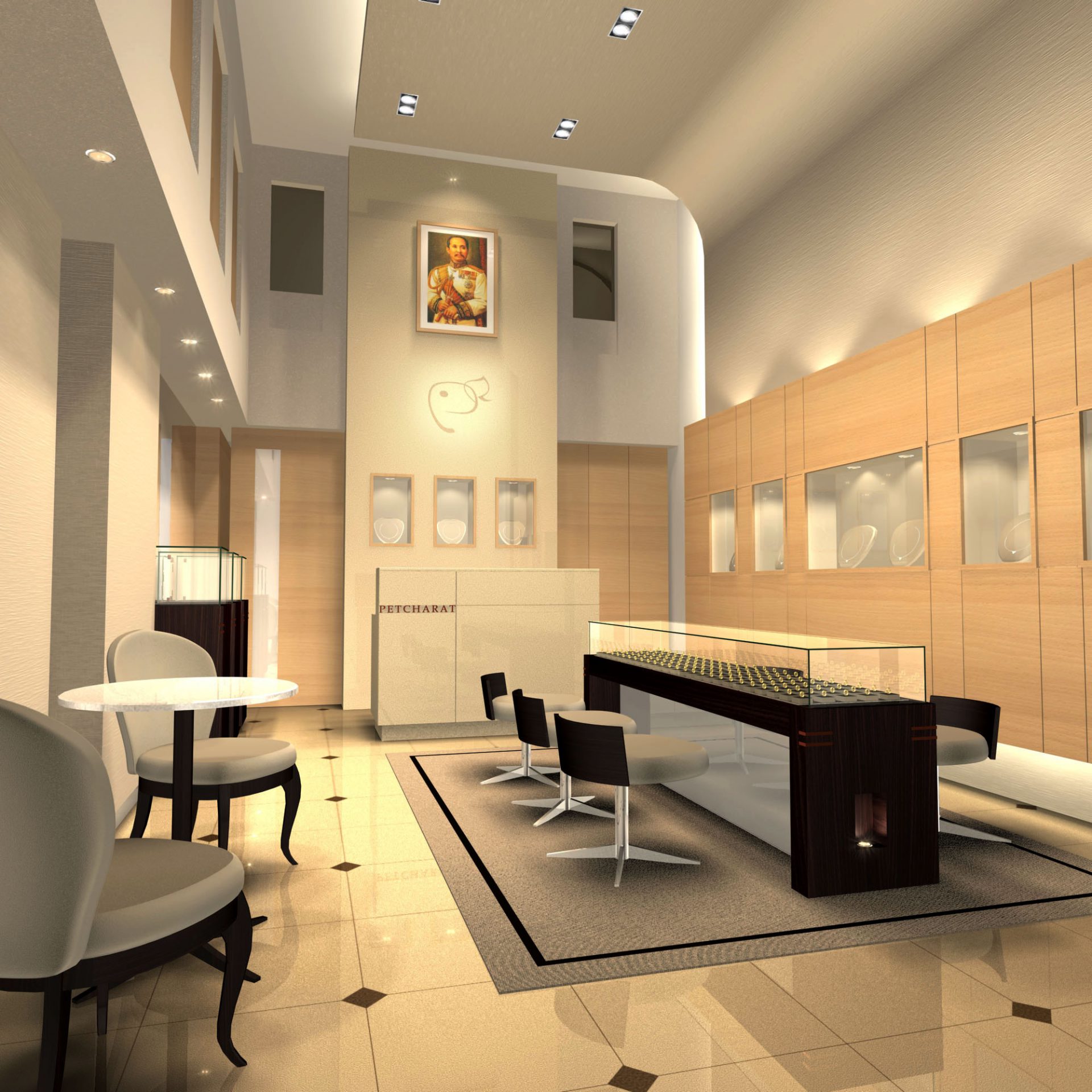 Jewelry shop -simple linear plan Display island table in the middle, Window display is to around the back wall insert with mirror for customer taste jewel, issue to concern gently security for jewel customer and other issue is lighting quality for check purity of diamond.