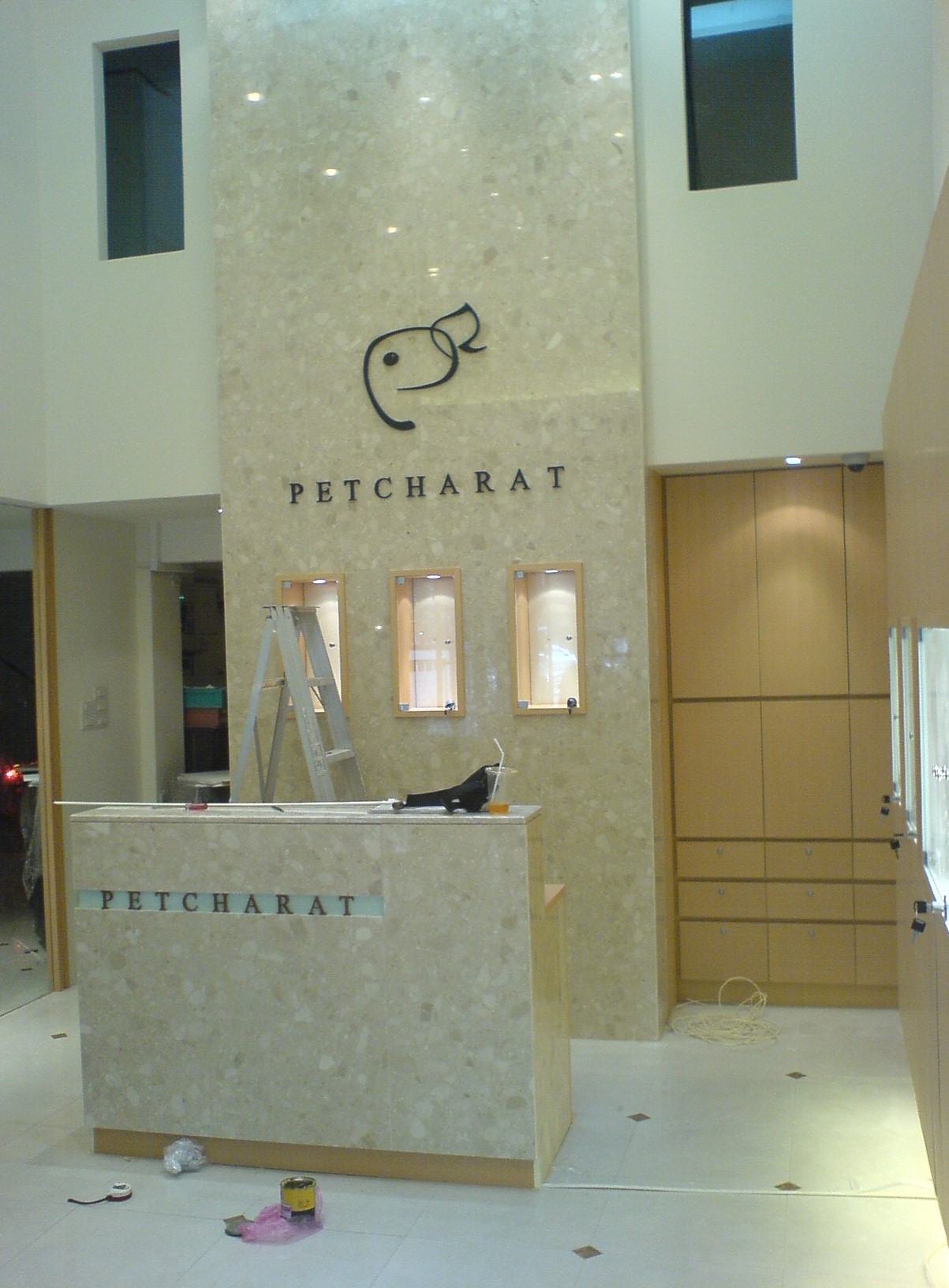 Material -Travertine marble feature wall, beech – dark-oak wood existing white tile floor to be covered with gentle light grey carpet.