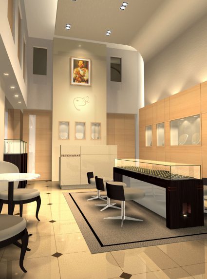 Jewelry shop -simple linear plan Display island table in the middle, Window display is to around the back wall insert with mirror for customer taste jewel, issue to concern gently security for jewel customer and other issue is lighting quality for check purity of diamond. Material -Travertine marble feature...